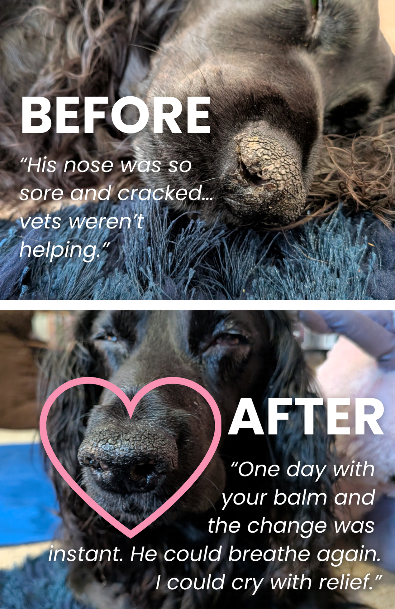 “His nose became so sore and cracked. The vets weren’t interested in helping, but when I found your balm and tried it — the change was instant. He could even breathe through his nose again. I’ve been so worried, but your balm has massively helped take away one of his stresses. Thank you so much.”